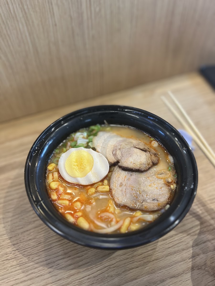 Miso flavor. Tofu, scallion, beans prouts, cabbage, corn, egg, and spicy sauce.